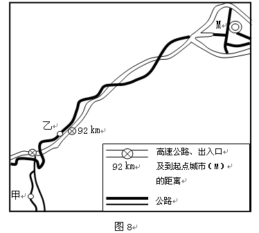 甲地某传统美食历史悠久,闻名遐迩。自从沿线高速公路建成后,以经营该美食为主的餐饮业在甲地逐渐衰落。而乙地日趋兴盛。图8示意区域中心城市M至甲地的交通线。