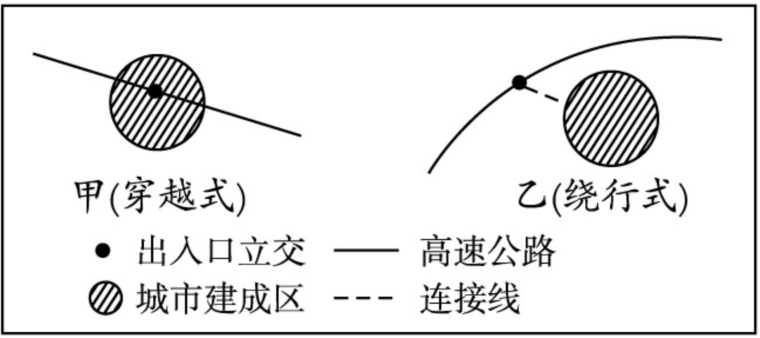 [解析]?高速公路为过境道路,出入口以外封闭,对建成区的内部交通没有替代作用,一般会布局于城市边缘,A项错误。随着建成区的扩展,原建成区边缘的高速路出入口会被新建城区包围,由乙模式变成甲模式,所以B项正确,C项错误。当大城市发展到成熟阶段时,建成区范围稳定下来,人口、产业规模相对稳定,交通压力不再增大,被包入建成区的高速路口可能由于惯性保留下来,出现两种模式并存的局面,D项错误。