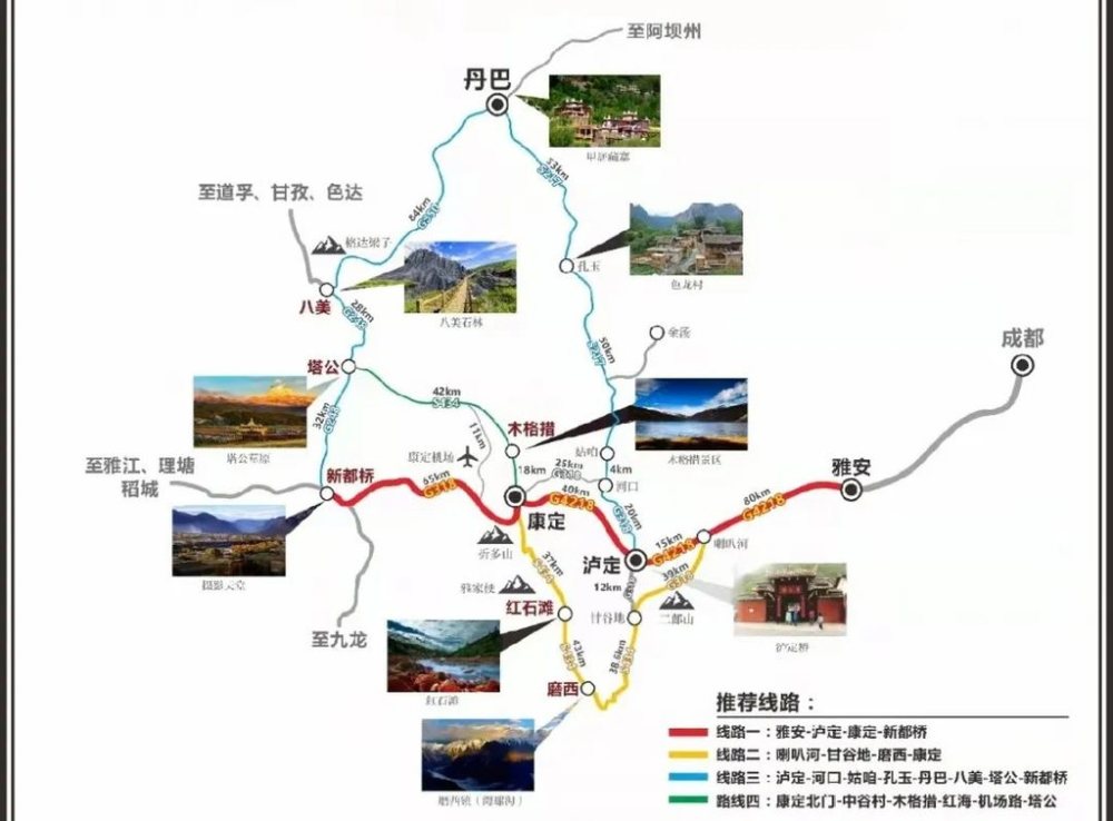 (2)建议经道孚八美镇至丹巴由阿坝出甘孜州