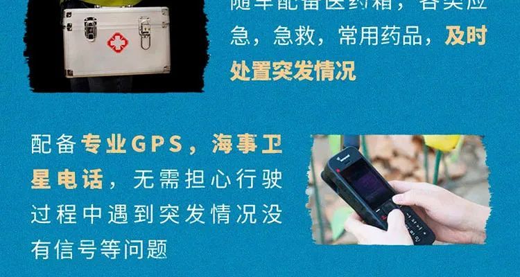 如遇到生病,全程在内任何时间与地点都会在2—3小时内送到最近城镇医院。不小心受伤等情况发生,不严重的情况下,随车配备急救医药箱,可以简单处理。