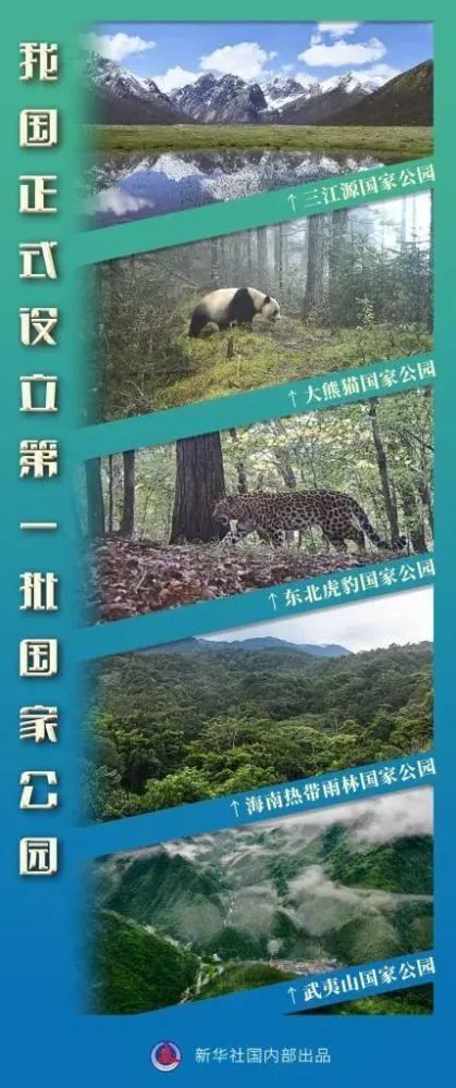 东北虎豹、大熊猫、三江源、海南热带雨林、武夷山、祁连山、神农架、普达措、钱江源和南山等10处国家公园体制试点。