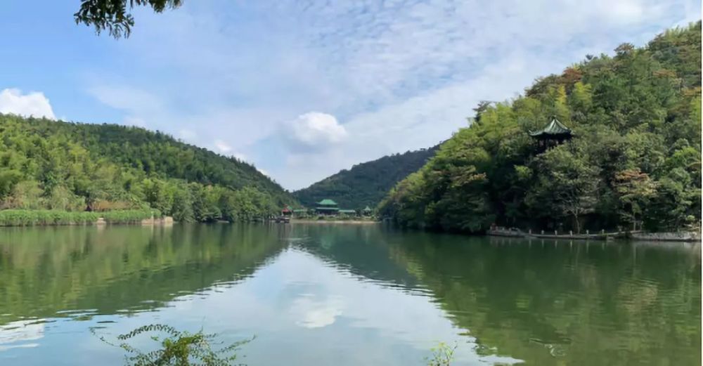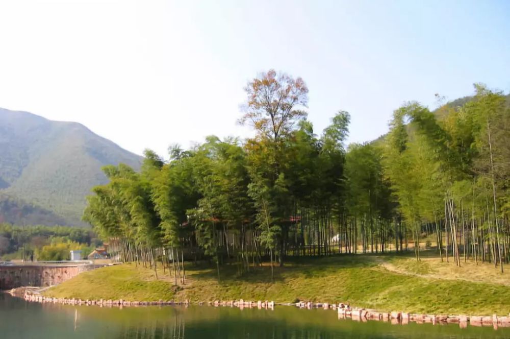 在竹海中,两山夹峙之间,山涧水和天然雨水汇集成了小小的“镜湖”,面积3万平方米,蓄水量15万立方米,最深处10米。湖水终年清冽,竹在水中长,水在竹间流,镜湖与绵延的竹海相映。