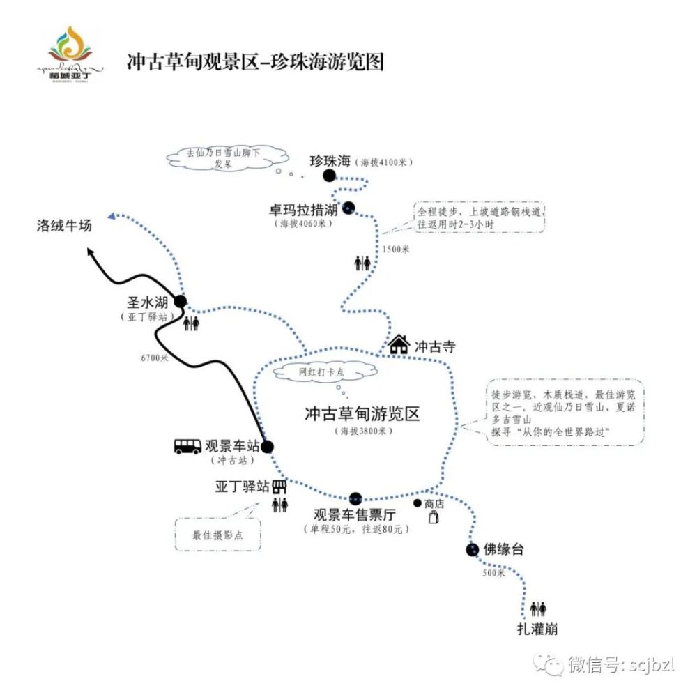 1:游客在冲古寺可选择钢格网栈道、步游道徒步1.5公里前往珍珠海,往返约2.5小时;沿途可以观冲古寺、卓玛拉措、珍珠海、仙乃日雪山、森林。