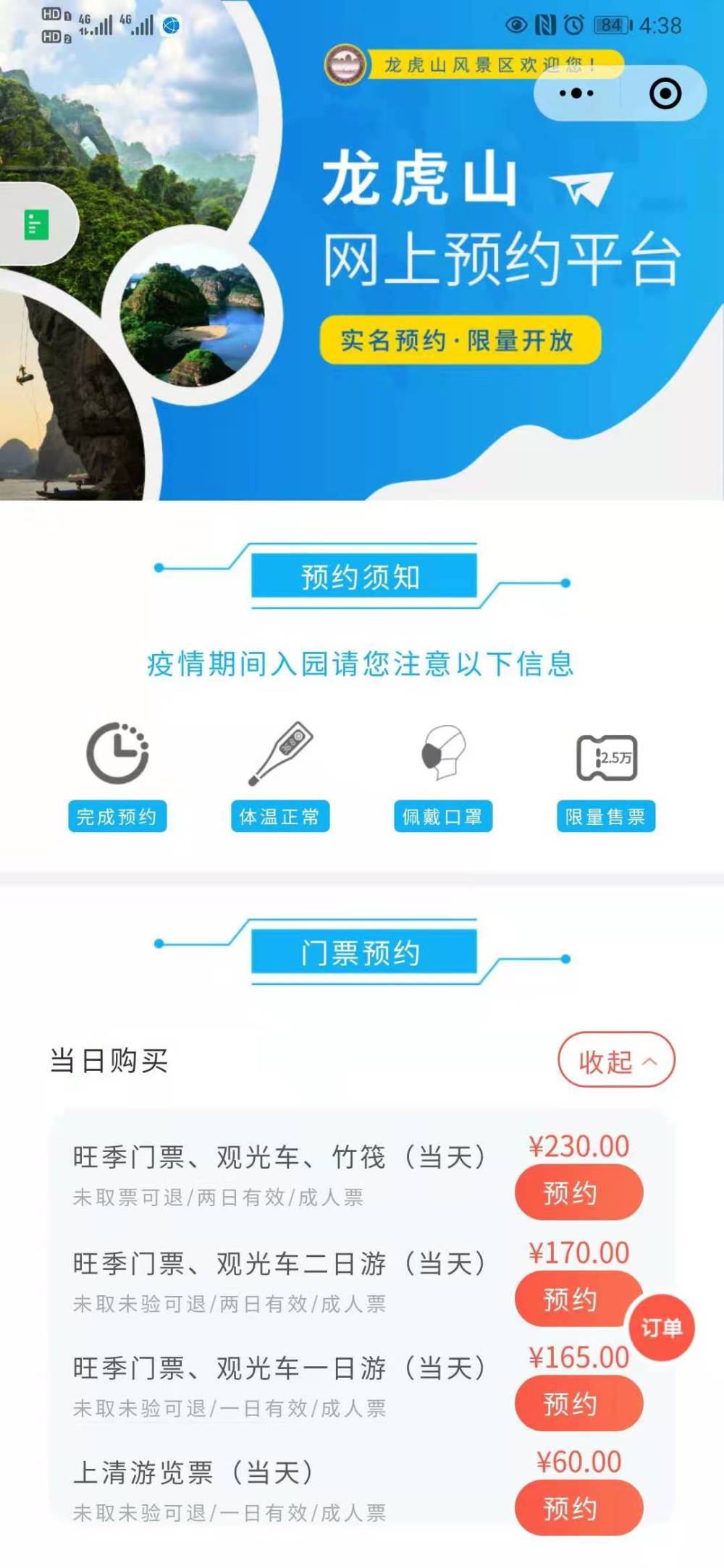 龙虎山景区在江西省率先打造了智慧旅游平台。依托该智慧平台,景区为游客带来了品质贴心的旅游体验和服务。一个手机、一个二维码,便能让游客轻松实现包括导游、导览、导航、导购等功能的智慧服务。截至目前,平台已入驻全市接近50%旅游相关商户,涵盖景点景区、星级酒店、农家乐、特色餐饮、休闲娱乐、文创商品店、旅行社等。游客凭借一部手机就可以直接查询、下单,预订门票、酒店餐饮、享受套票优惠,“一机游”给游客带来了高品质、更贴心的服务,让旅途变得轻松无忧。