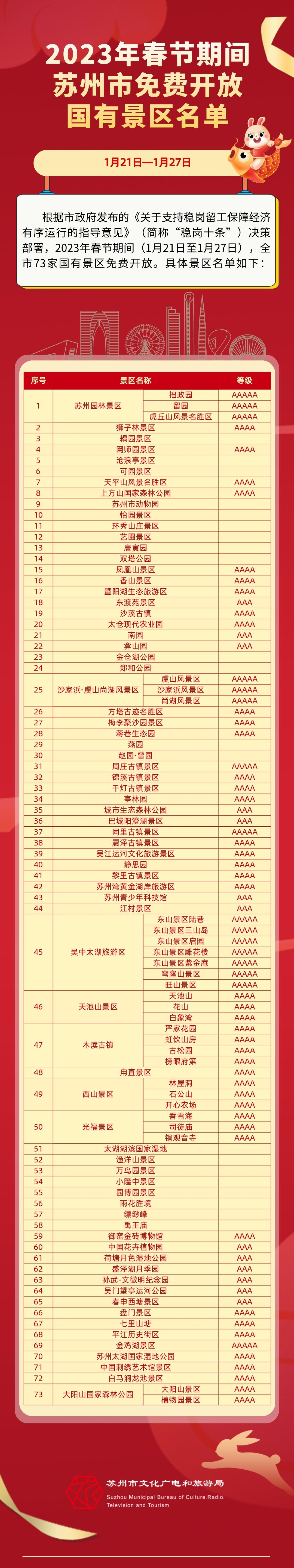 2023年春节期间(1月21日至1月27日),全市73家国有景区免费开放。活动期间,各景区将继续采取实名预约参观、游览,市民游客需提前1-7天预约。