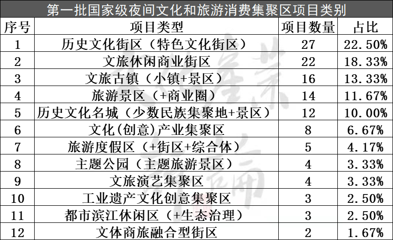 10月19日,文化和旅游部公布了拟入选第一批国家级夜间文化和旅游消费集聚区120个项目名单,文化产业评论(ID:whcypl)经梳理发现,首批120个项目按类别大致可分为:历史文化街区型、文旅休闲商业街区型、文旅古镇(特色小镇)型、旅游景区型、历史文化名城型、文化(创意)产业集聚型、旅游度假区型、主题公园型、文旅演艺型、工业遗产创意型、都市滨江休闲型及文体商旅融合型等12个类别。