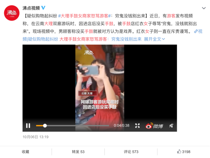 然而,今年国庆中秋双节最引人注目的,就是这个“大理双廊古镇不买鼓就辱骂游客”的视频!视频中,手鼓店店员与两名游客发生冲突,游客表示因进店后价格不合适没买手鼓,被手鼓店红衣女子认为是戏弄,辱骂其“穷鬼,没钱就别出来”。视频一经发出,引起了网友们的轩然大波,多个微博话题讨论热度过10W!