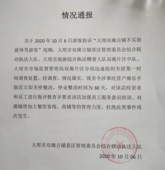 好在事发当天下午,大理文化和旅游局在微博通报中称:经调查,网友反映的情况属实,责令涉事经营户廊乐手鼓店立即关停整改,即日起停业整改30天。整改结束后,经双廊古镇景区管委会同意后方可恢复营业。可以看出,这次整改的速度快、力度大!