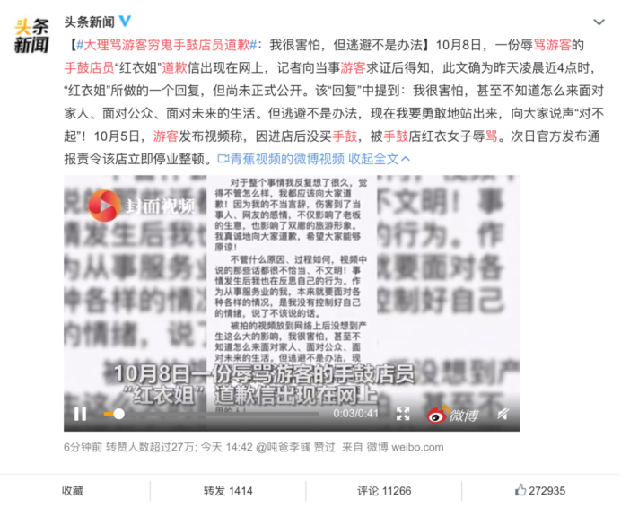 就在昨天,一份辱骂游客的手鼓店员红衣女子道歉信出现在网上,该“回复”中提到:我很害怕,甚至不知道怎么来面对家人、面对公众、面对未来的生活。但逃避不是办法,现在我要勇敢地站出来,向大家说声“对不起”!同时表示事发视频被游客掐头去尾、断章取义。但小编觉得,不论怎么样,打开门做生意是为了求和,游客外出旅行是为了开心,商家要具备最基本的服务素质,才能杜绝此类事情的发生!