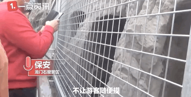 这还不算什么,景区中有一些千年佛像紧邻过道,虽然有围栏保护,家长们却将孩子抱起来去触摸,甚至有小孩直接从护栏下面的缝隙里钻了进去,家长则负责在护栏外拍照。据景区工作人员介绍,本来就受到自然风化影响的佛像,因人为的触摸加剧了损害程度,景区采取新措施紧急架起2米高铁网!护栏上还加装了警示牌,提醒游客请勿触摸、请勿翻越栏杆。