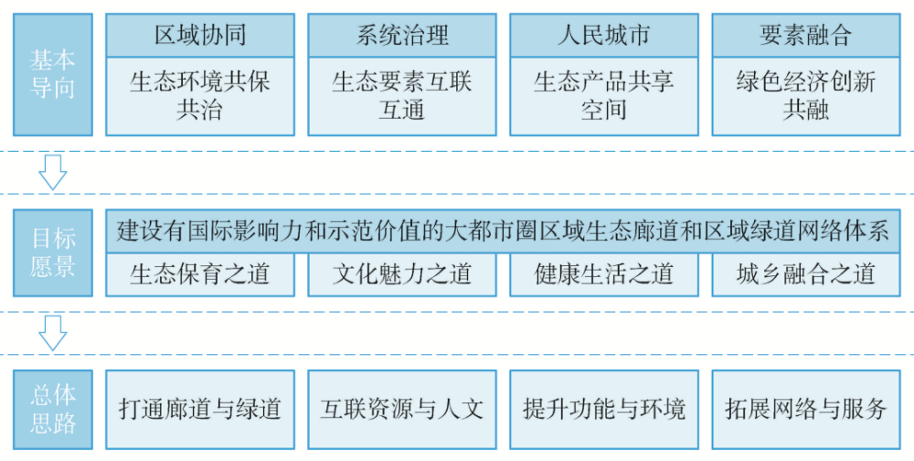 总体上,面向2050年,建设有国际影响力和示范价值的上海大都市圈区域生态廊道和区域绿道网络体系,真正体现区域“生态共治、环境共建、绿色共享、经济共融”,彰显长三角一体化的绿色示范与引领作用,努力建设区域绿道城市群的全球样板,实现“跨越山海、梦回水乡,魅力河川、青山百里”的规划愿景。