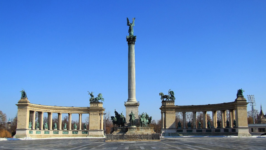 英雄广场(Heroes’ Square)是布达佩斯的地标性建筑,于1896年为纪念匈牙利建国1,000周年而修建。广场周围环绕着匈牙利历史上14位杰出人物的雕像,而大天使加百列(Gabriel)则立于中心柱顶端。这座雕像在1900年的巴黎世界博览会上被授予特等奖。