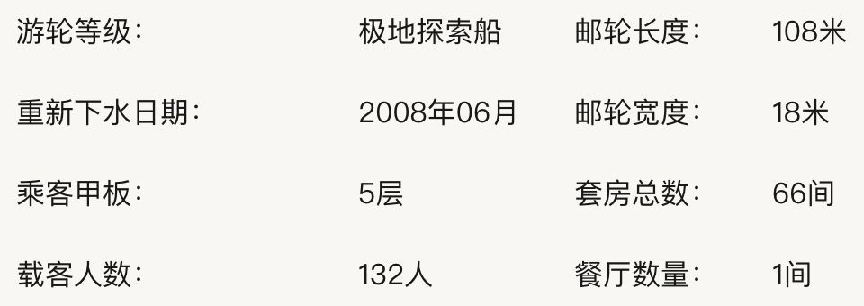 还有就是四王中的世邦和银海了,这是19-20航次中体验最好的船,肯定能让你住的最爽、吃的最爽。至于玩上面,个人觉得科考船、探险船会有意思一些。