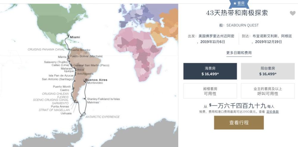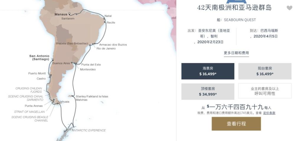 在过去的12年中,一直运营乌斯怀亚往返南极的航线,下图是19-20航期的线路,最低价格才5,460美元,性价比还真的是挺高的。