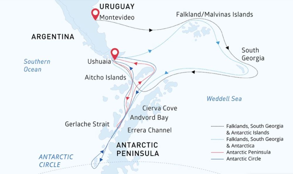 庞洛19-20航次的南极行程,主要4个航线,从最基础的到南极半岛,到深入南极圈并到南极三岛的都有。