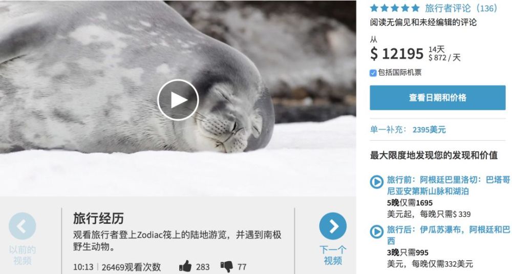 Grand Circle今年有一个船期是在南极,包了美国-布宜诺斯艾利斯-乌斯怀亚的往返机票,14天的行程12,195美元,平均每天872美元。