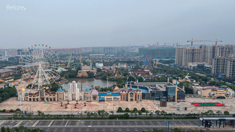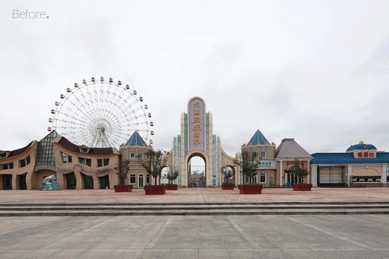 原园区内建筑均为乐园风格,或卡通或戏剧化,已不符合园区未来定位。建筑立面的更新是在保留建筑结构的基础上调整立面设计语言,整体提升外立面风貌,以促进园区整体风貌和氛围感的塑造。