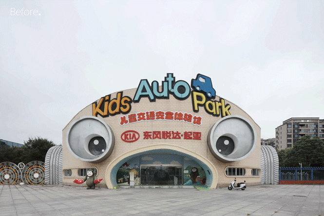 ▲建筑改造前为拟人化的卡通汽车形象,改造后的建筑立面采用了现代设计语言,为建筑和场地增添了动感