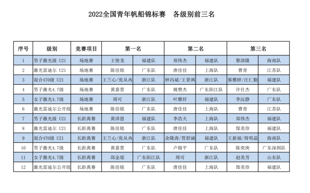 经过为期6天的角逐,最终,福建队王俊龙、广东队陈佳铭、浙江队王兰心/张从冉、广东队黄嘉萱、浙江队周可、广东队陈佳铭分别获得ILCA7级U21、ILCA6级U21、混合470级U21、男子ILCA4级、女子ILCA4级、ILCA6级公开组场地赛冠军。