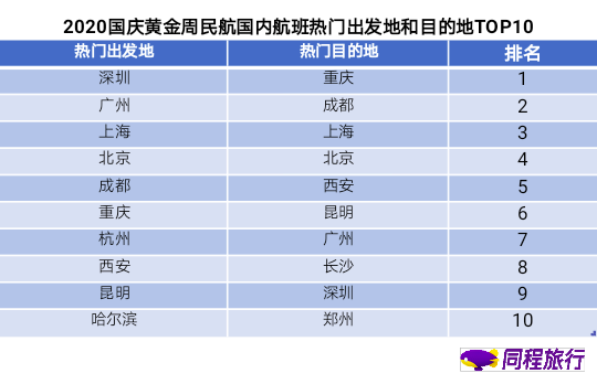 《报告》基于同程旅行平台的搜索及出行预订数据预测了2020年国庆黄金周期间铁路出发及到达客流量较大的前十个城市。数据显示,广州、深圳、北京、上海、长沙、重庆、成都、西安、南昌、武汉是今年国庆黄金周期间出发客流量前十名,同时,这十个城市也是客流量较大的到达城市。与2019年国庆黄金周相比,广州有望取代北京成为进出港客流量最大的城市,深圳、上海、重庆、成都的排名均有不同程度的上升。值得关注的是,4月份取得抗疫胜利的武汉也位列今年国庆黄金周铁路客流量出发及到达目的地的前十名,充分表明了国内旅游市场的消费信心正在加速恢复中。