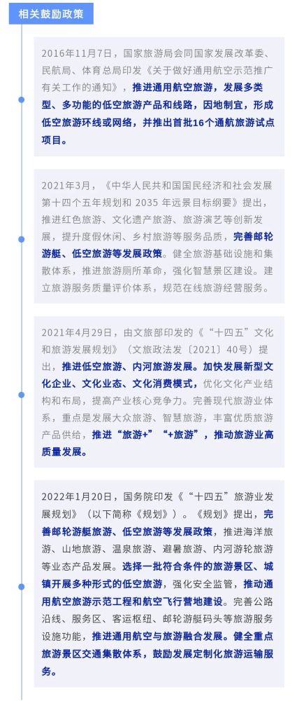 2022年1月20日,国务院印发《“十四五”旅游业发展规划》(以下简称《规划》)。《规划》提出,完善邮轮游艇旅游、低空旅游等发展政策,推进海洋旅游、山地旅游、温泉旅游、避暑旅游、内河游轮旅游等业态产品发展。选择一批符合条件的旅游景区、城镇开展多种形式的低空旅游,强化安全监管,推动通用航空旅游示范工程和航空飞行营地建设。完善公路沿线、服务区、客运枢纽、邮轮游艇码头等旅游服务设施功能,推进通用航空与旅游融合发展。健全重点旅游景区交通集散体系,鼓励发展定制化旅游运输服务。
