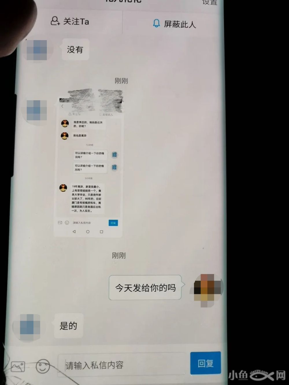 大过节的,发点负能量很不耻,这个网络骗子目前名誉上是我老公,有很多小号。目前我所知有5个,换着不同的号活跃。我一直不明白他有两个孩子了,为什么留言要跟人家说还想要个孩子。后来一想那不是赤裸裸的为约炮找个冠冕堂皇的借口,人设是老实真诚,希望姑娘们擦亮眼睛,网恋有风险,像这样的骗子很多。