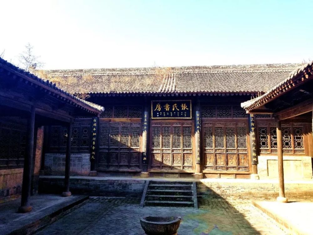 位于甘肃省庆阳市宁县中村镇政平古文化旅游村堡子山顶上,系清代张姓氏族(巷子张家)所建。“张氏书房”整体坐西向东,是一组布局严谨、曲折幽静的清代四合式庭院,占地面积约817平方米。现存单檐砖木结构硬山顶上房、南北厢房及下房,上房、下房各7间,南北厢房各3间,上房和两厢房走廊设有明柱,槅扇门做工考究,格心为龟背锦式样,槅扇窗全是大型套格雕花,有博古、松鹤祥云、梅兰竹菊等图案,雕饰工艺十分精细,生动活泼,内涵深刻,富于变化,建筑风格独特、工艺价值高,为庆阳市民居古建筑的代表。