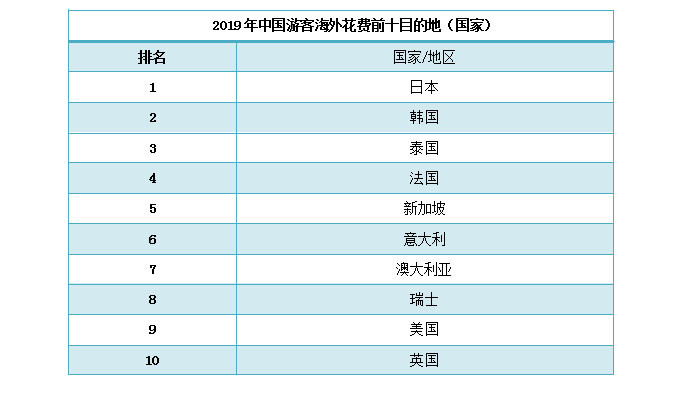 中国游客十大热门消费国家依次是:日本、韩国、泰国、法国、新加坡、意大利、澳大利亚、瑞士、美国、英国。日本、韩国、泰国是消费活跃度最高的三大近程市场。在远程市场中,法国、意大利、澳大利亚、美国消费热度最高。