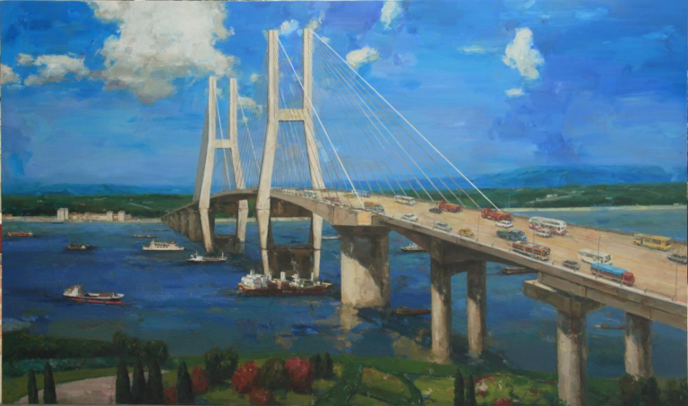 油画《皖江第一桥》,画面鲜活生动,展示了这座桥的雄伟气势和新颖造型,合肥工业大学教授巫俊介绍说: