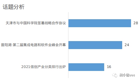 话题方面,内容聚类显示,5月10日~16日,舆论聚焦的信创话题包括“天津市与中国科学院签署战略合作协议”、“晋阳湖·第二届集成电路和软件业峰会开幕”和“2021信创产业分类排行出炉”。