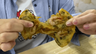 一勺带有韭菜的米糊、两三只鲜虾,放进油锅里,不停地翻滚、补漏,经过油炸的虾饼香气四溢,一个个炸得金黄酥脆的虾饼就出炉啦,油香味扑面而来。尝一口外脆里嫩,鲜香可口,新鲜饱满的虾肉Q弹爽口,很有嚼劲,吃一口回味无穷。