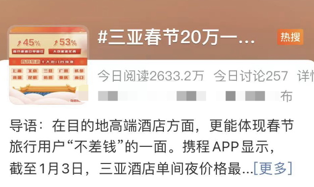 同时,截至1月3日,三亚酒店单间夜价格最高为20万元以上,西双版纳酒店单间夜价格最高为将近8万元。目前两家酒店的春节相关客房,在携程平台上都显示已售罄。