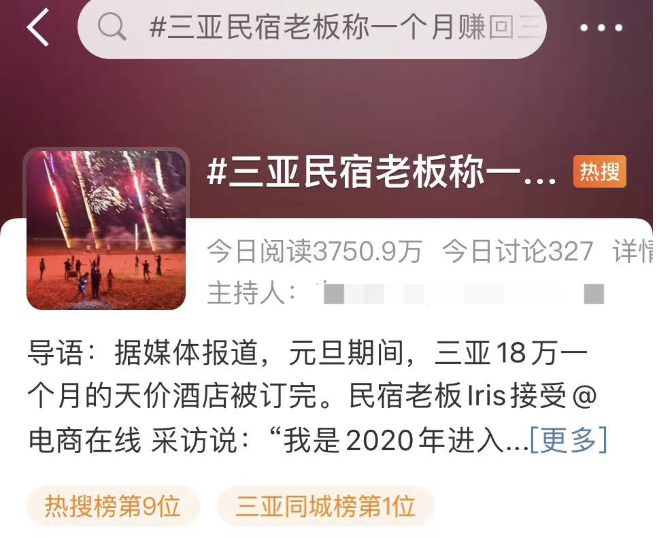 三亚有民宿老板向媒体表示,一个月赚回过去3年的亏损。据悉,除了三亚春节20万一晚的酒店目前已售罄,许多三亚民宿长租别墅月租5-6万元,涨了2倍有余,依旧被订满。