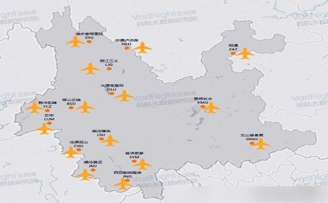 云南省目前运营的有昆明、丽江、西双版纳、芒市、大理、腾冲、迪庆、普洱、临沧、保山、昭通、文山、泸沽湖、沧源、澜沧15个机场,除昆明外,丽江、大理、西双版纳、芒市、香格里拉、普洱均有开通国内部分城市直飞航线。