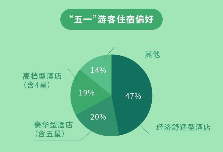 “休闲化”同样是“五一”假期旅游的一大特征,在游客的住宿选择上表现得尤为明显。1-2人出游订单占订单总量的49%,3-5人出游订单占订单总量的34%,情侣、闺蜜、亲子家庭是其中的主流客群,这类人群在住宿偏好方面更舍得为“住得好”买单,近四成游客选择入住“高星酒店”,这也让酒店成为“五一”假期休闲度假的新胜地。