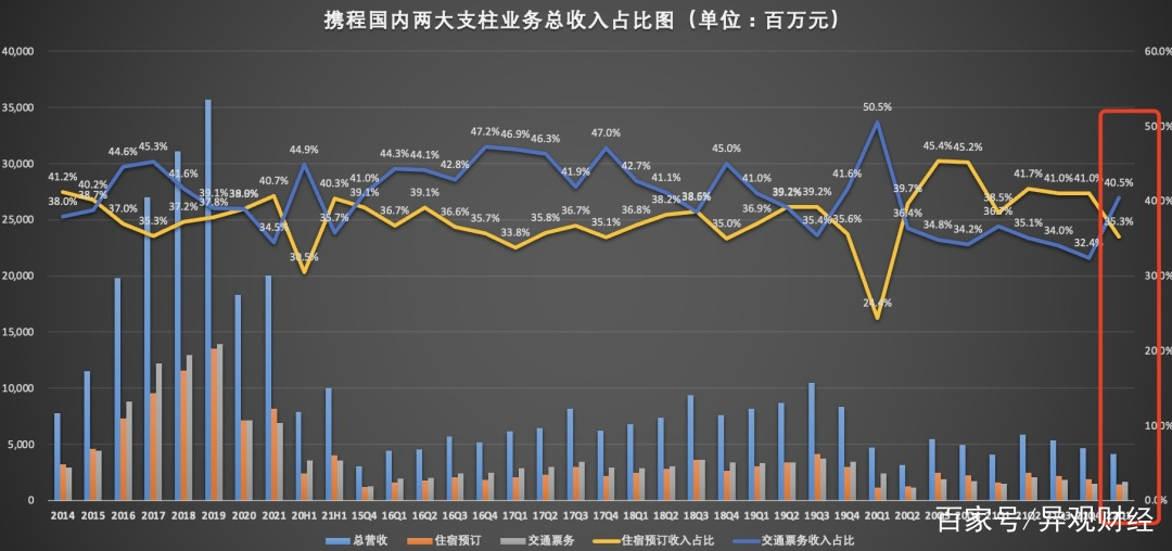 总体来看,住宿预订和交通票务是携程国内业务的两大支柱业务。2022年一季度之前,住宿预订是携程最大收入来源,本季度交通票务实现唯一正增长业务,也让该项业务首次晋升为携程第一大收入来源。