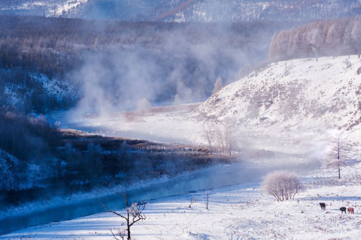 不冻河是哈拉哈河的一段河流,哪怕在零下30℃的寒冬,这里的河水也不会结冰,仍然水流淙淙,保持着几度的温度,非常奇妙。