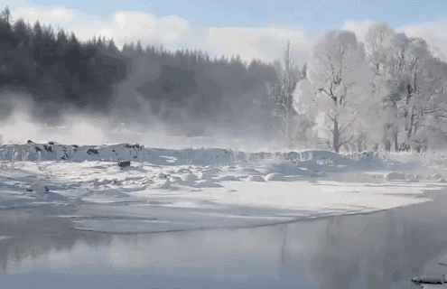 其实河流下有大量地热,常年冒着温泉,阳光照射下,雾气腾腾,与河边的雾凇雪景交相辉映,美不胜收。