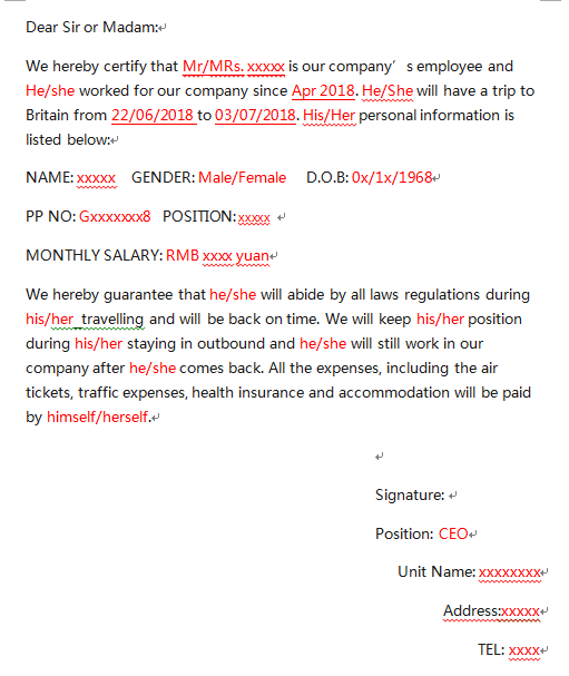 最好使用公司抬头纸打印,留下单位负责人真实电话,大使馆可能会电话至公司核实情况