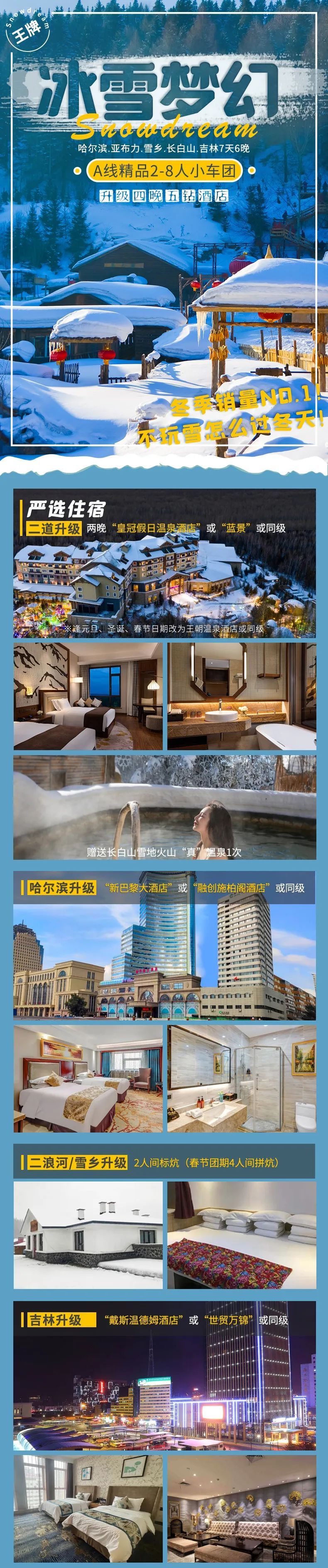 正价团期:12月、1月、2月(不含春节,圣诞/元旦日期长白山改住王朝酒店)