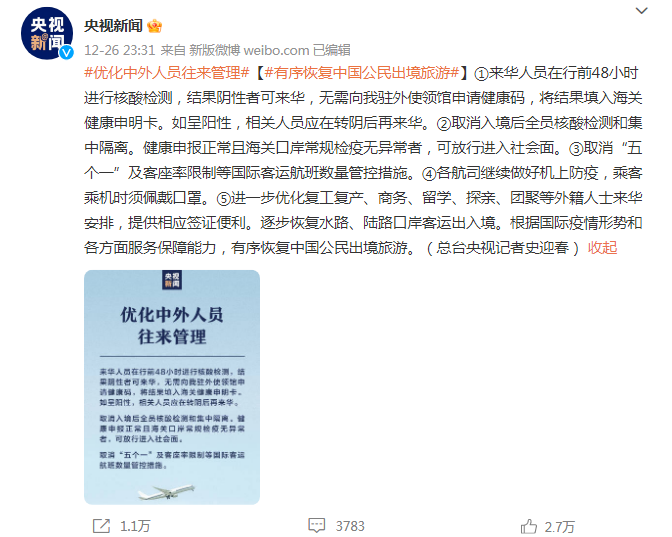 在12月26日,我国最新发布关于“优化中外人员往来管理”、“有序恢复中国公民出境旅游”的最新政策,其中明确规定了在明年1月8日起取消入境隔离和全员核酸检测措施。在经历了3年的严格出入境措施后,中国终于要放开国门,回国后再也不用隔离、不用做核酸,而且明年可以自由地出境旅游!