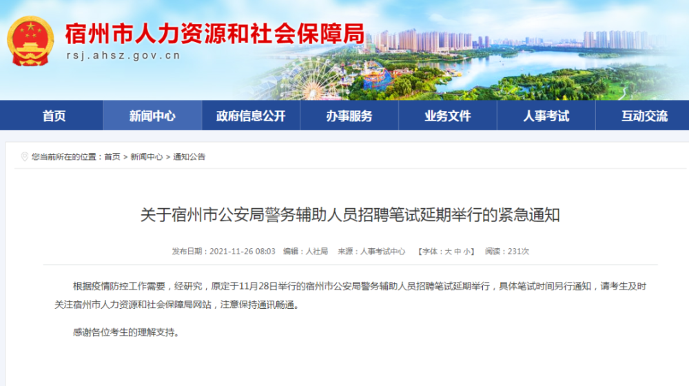 根据疫情防控工作需要,经研究,原定于11月28日举行的宿州市公安局警务辅助人员招聘笔试延期举行,具体笔试时间另行通知,请考生及时关注宿州市人力资源和社会保障局网站,注意保持通讯畅通。