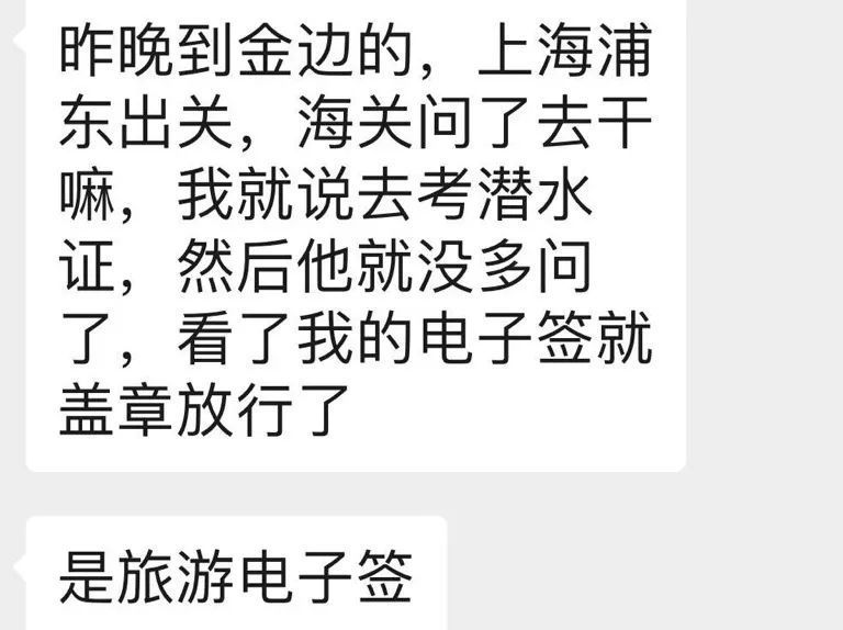 到了上海浦东机场后,海关问他出境目的,他表示去考潜水证,然后出示了电子旅游签证,海关就给盖章放行了,总体来说算是“丝滑出境”了。