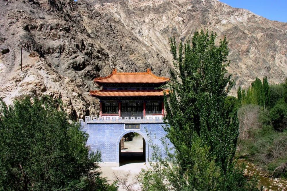 位于库尔勒市北郊8公里处,扼孔雀河上游陡峭峡谷的出口,曾是南北疆交通的天险要冲,古代"丝绸之路"中道咽喉。晋代在这里设关,因其险固,故称"铁门关",列为中国古代二十六名关之一。