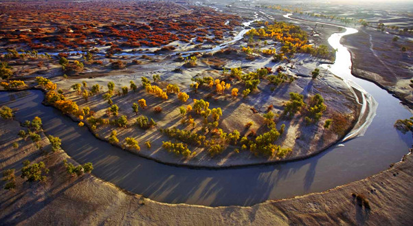塔里木河为中国第一大内陆河,全长2179公里,它由叶尔羌河、和田河、阿克苏河等汇合而成,河水很不稳定,被称为"无缰的野马"。