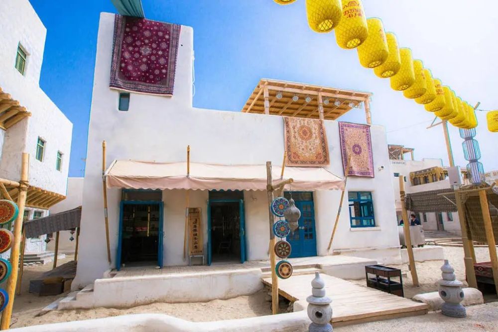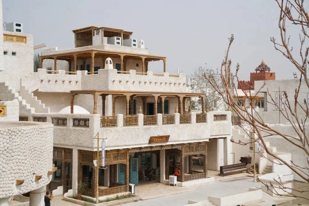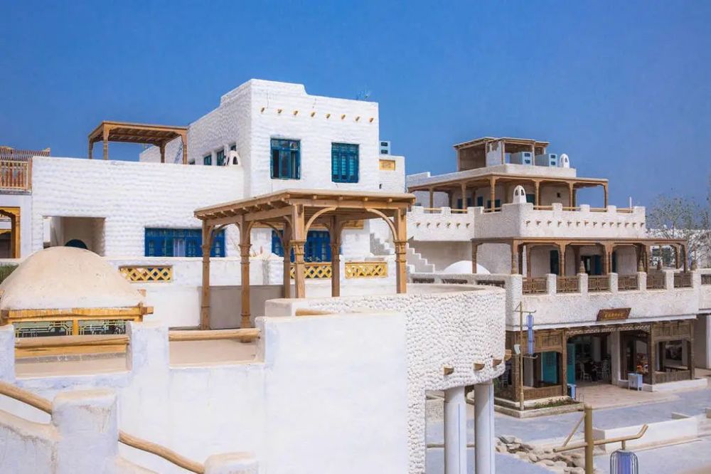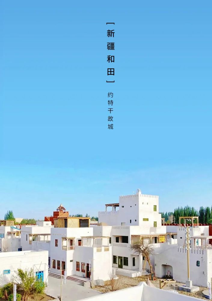 从上空俯瞰是一座四方城,瓦蓝晴空与洁白的建筑,在红白相间的方字形城池中,错落有致的白色房屋,色彩靓丽的廊顶,蓝色门窗、雕花廊柱,每一个场景都在讲述着于阗古国的神秘,唐朝的玄奘高僧也曾途经此地,为这座故城留下了浓墨重彩的一笔。