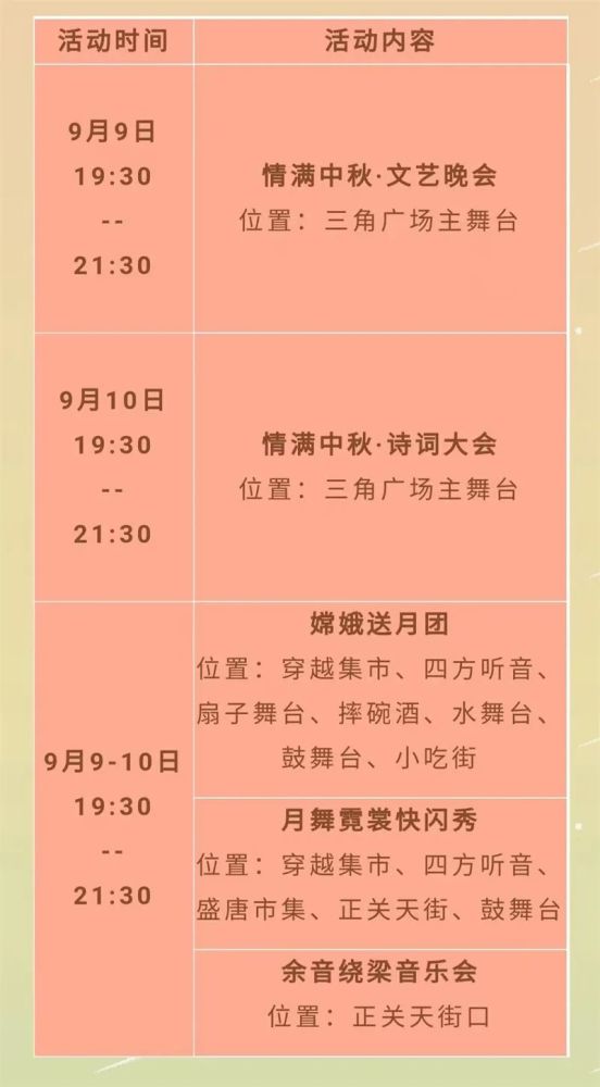 9月9日—10日19:30—21:30,“嫦娥姐姐”将率众仙子上演美轮美奂的古风快闪秀,邀请广大游客共度佳节。