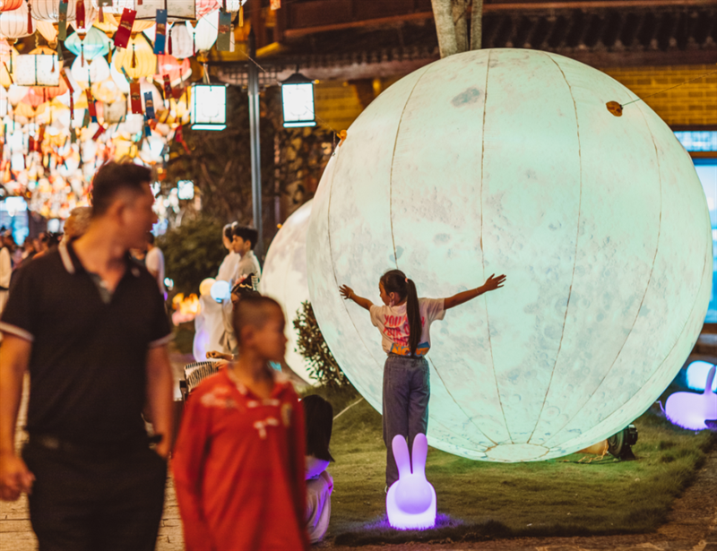 节日期间,在茶马古城的城门之上,将有直径达10米的“超级月亮”绝美空降,带来近距离“探月体验”。同时,古城街区内也会有“2米发光月球+玉兔”驻场,让你的每一张照片都能“霸屏”朋友圈。