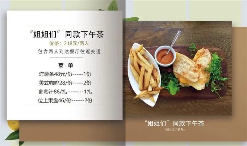 “姐姐们”在小熊猫庄园湿地景观餐厅享用了午餐和下午茶,同款双人下午茶套餐(218元/双人),同款午/晚餐套餐998元/桌(8—10人一桌)。