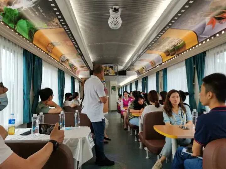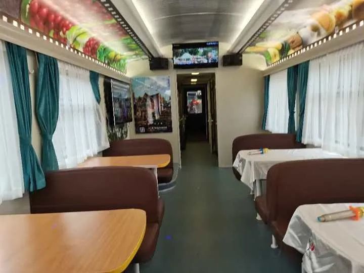 多功能餐车厢是整列火车的一大亮点,这节车厢以普通餐车为原型进行改造,尾端加装了一个小舞台,安装了LED炫光及高端卡拉ok影音设备,可实现小型演艺演出。